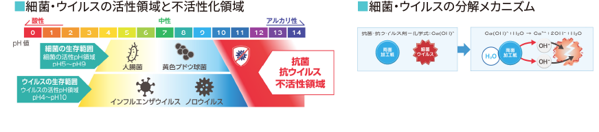 抗菌・抗ウイルス加工のpH領域は11以上の強アルカリ性です。このpH領域では細菌・ウイルスが不活性化(生存できなく)されます。菌に含まれる水分と反応し直ちに抗菌効果を発揮します。