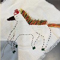 カラフルな刺繍糸を使って躍動感ある馬を表現した年賀状です。